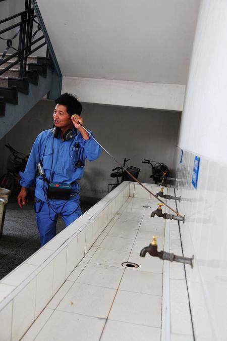 圖為供水公司聽漏人員對學(xué)校供水管道進(jìn)行聽漏